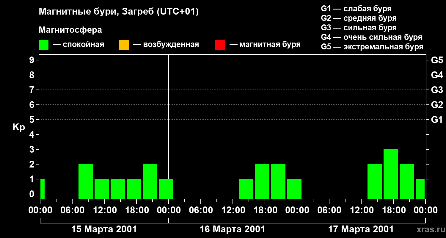 Изменения геомагнитного индекса Kp с 15 по 17 марта 2001 года для средних широт