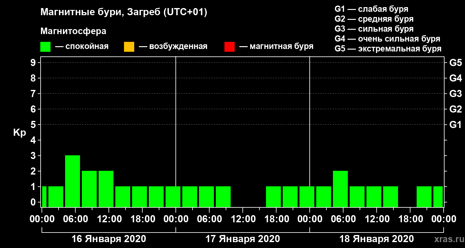Изменения геомагнитного индекса Kp с 16 по 18 января 2020 года для средних широт