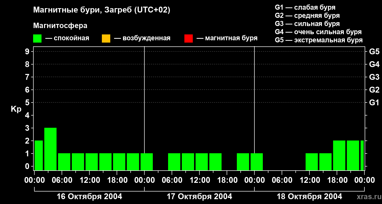 Изменения геомагнитного индекса Kp с 16 по 18 октября 2004 года для средних широт