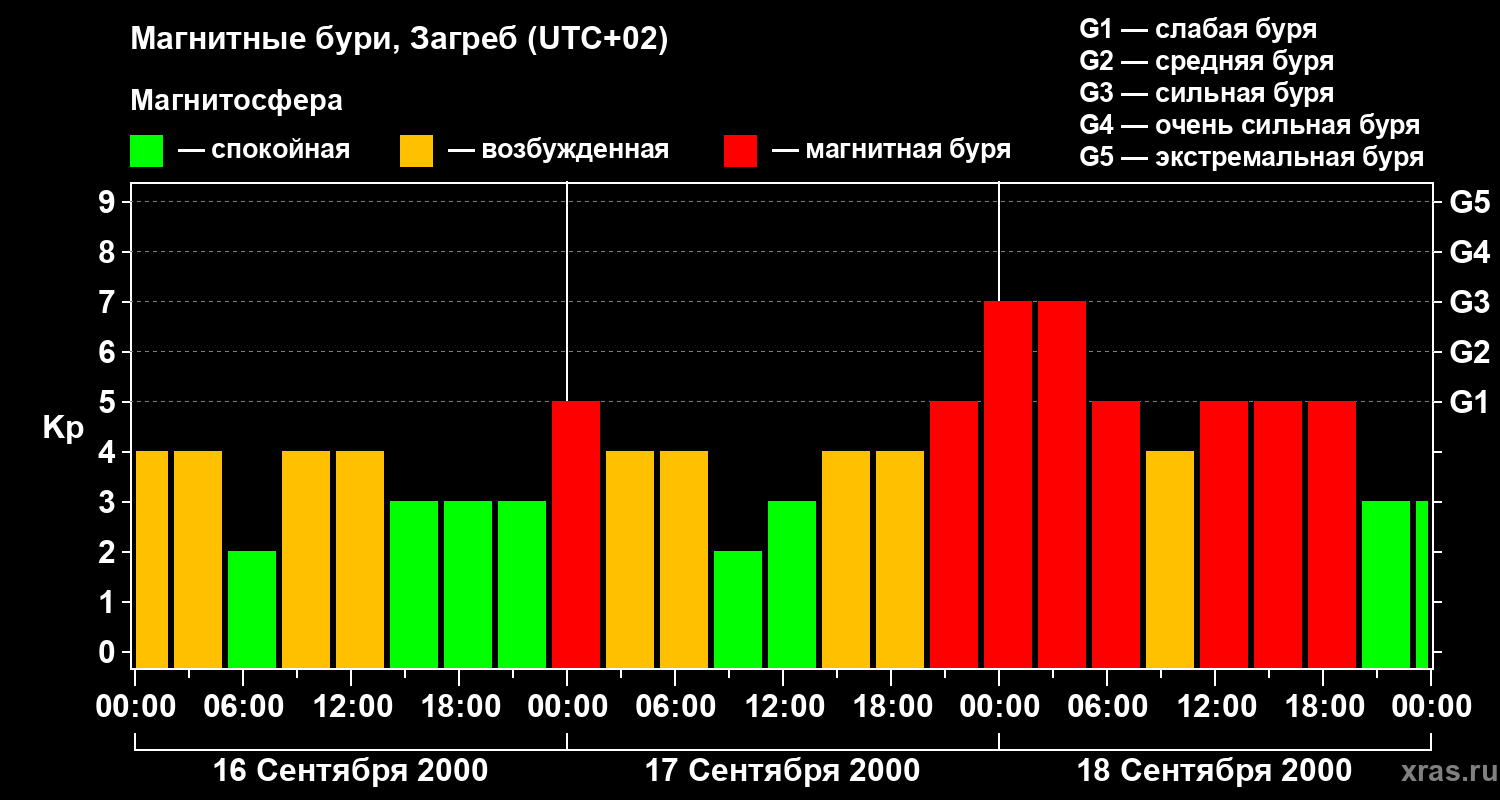Изменения геомагнитного индекса Kp с 16 по 18 сентября 2000 года для средних широт