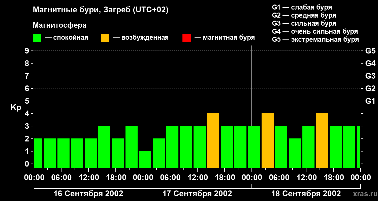 Изменения геомагнитного индекса Kp с 16 по 18 сентября 2002 года для средних широт
