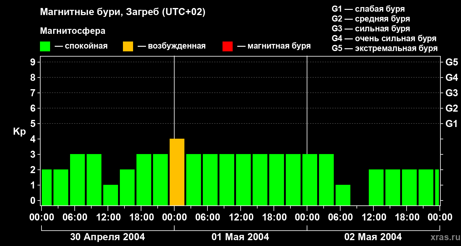 Изменения геомагнитного индекса Kp с 30 апреля по 2 мая 2004 года для средних широт