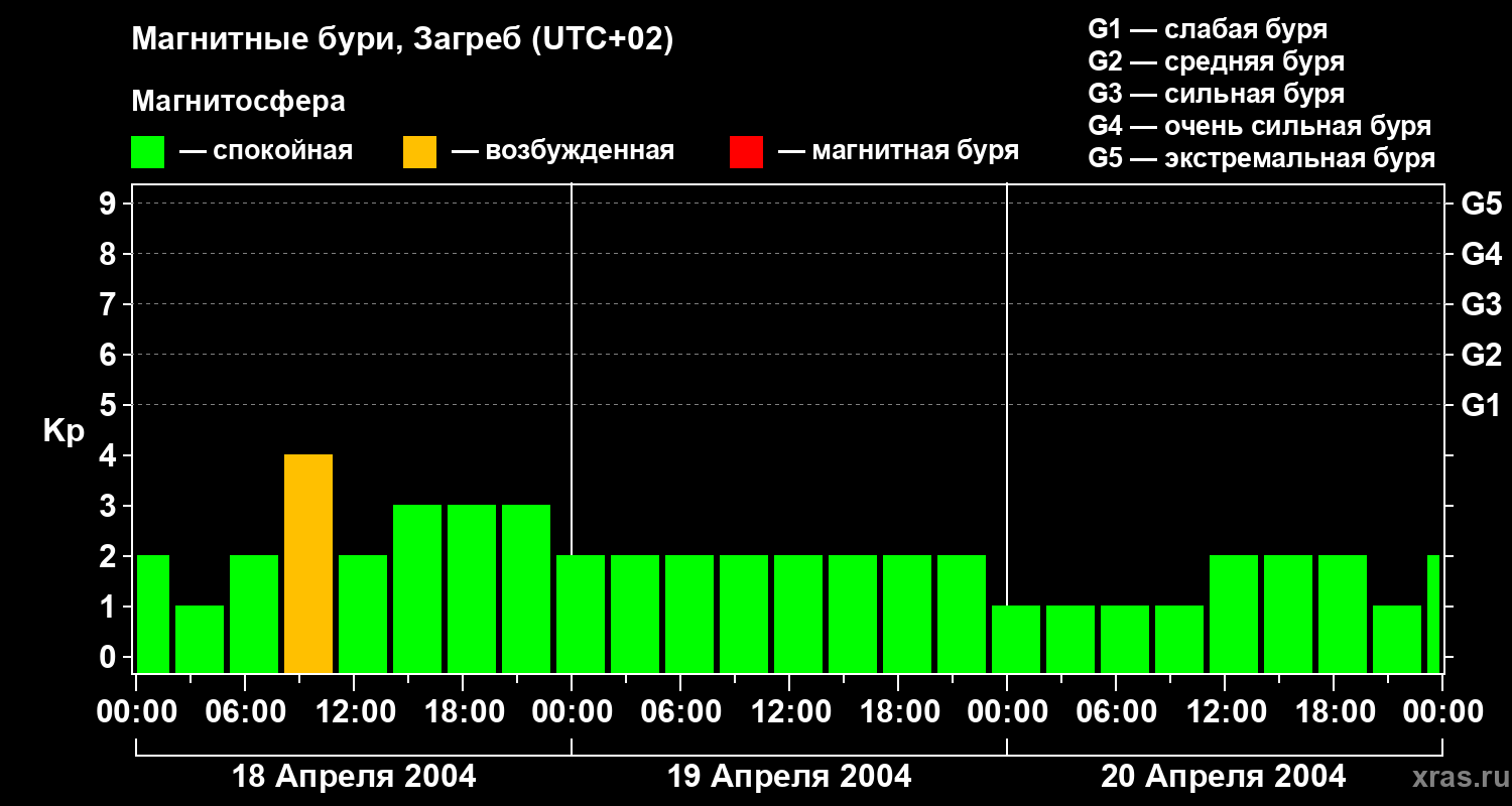 Изменения геомагнитного индекса Kp с 18 по 20 апреля 2004 года для средних широт