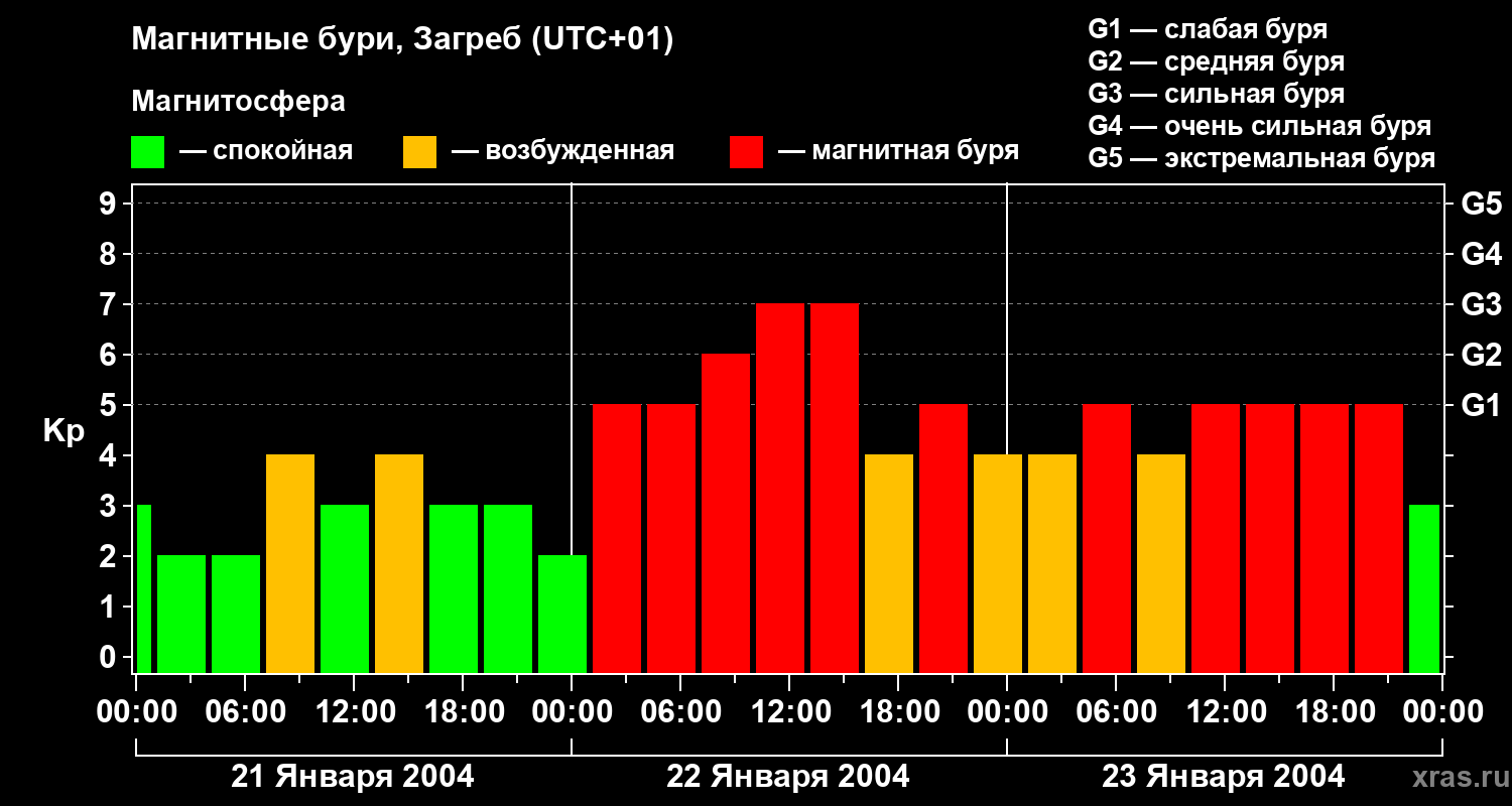 Изменения геомагнитного индекса Kp с 21 по 23 января 2004 года для средних широт