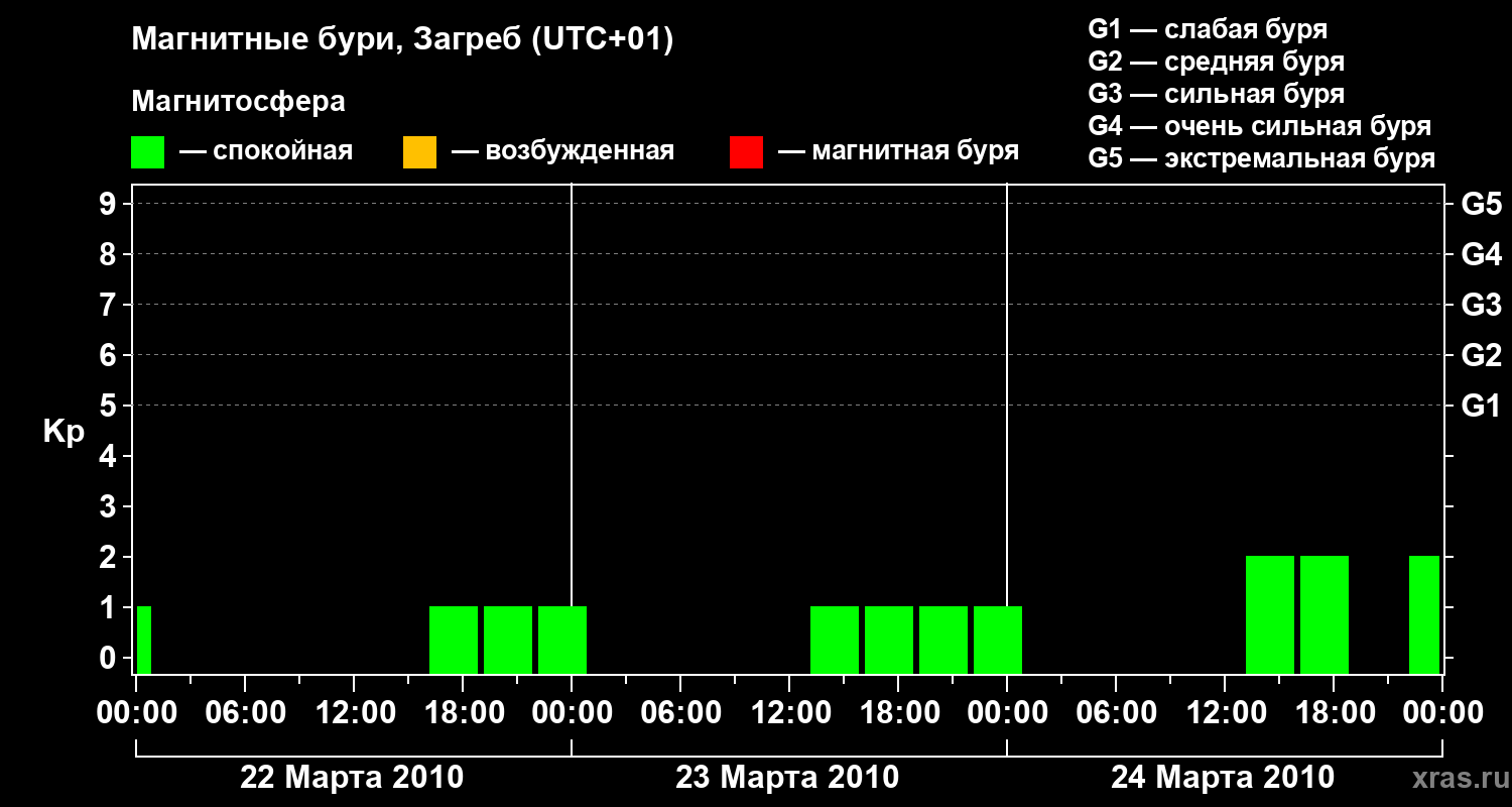 Изменения геомагнитного индекса Kp с 22 по 24 марта 2010 года для средних широт