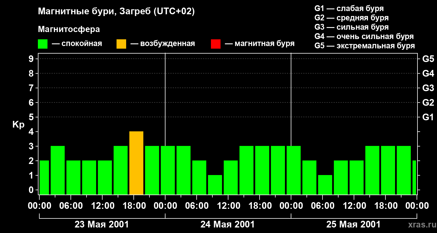 Изменения геомагнитного индекса Kp с 23 по 25 мая 2001 года для средних широт