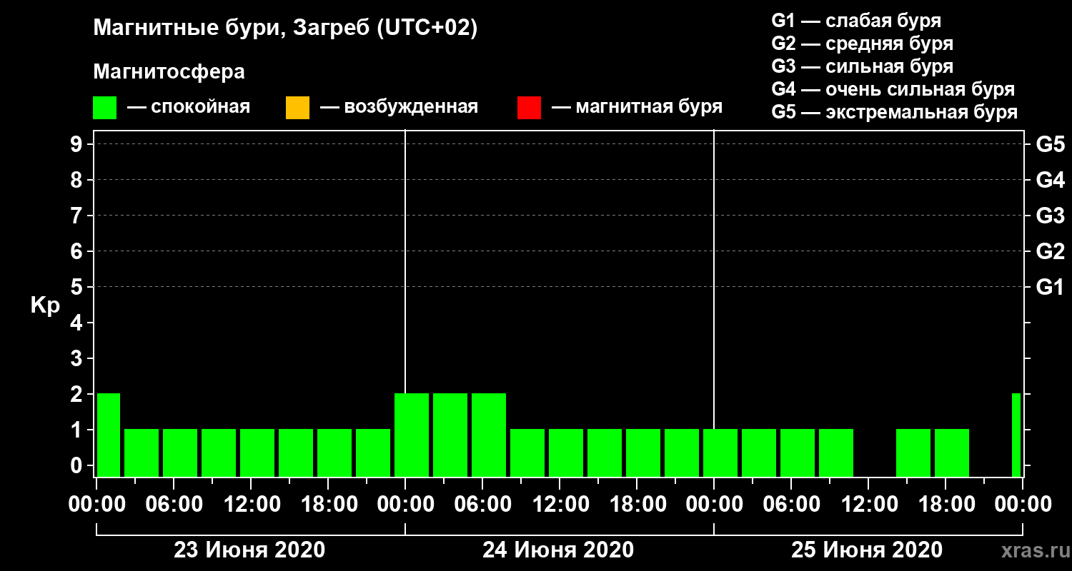 Изменения геомагнитного индекса Kp с 23 по 25 июня 2020 года для средних широт