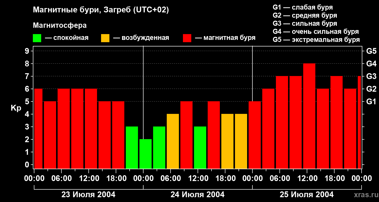 Изменения геомагнитного индекса Kp с 23 по 25 июля 2004 года для средних широт