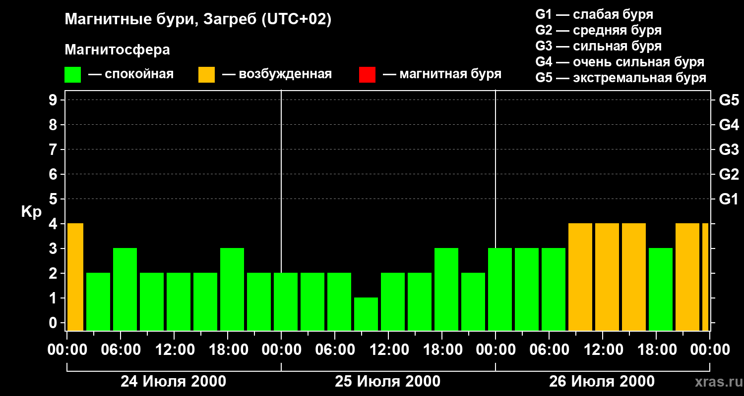 Изменения геомагнитного индекса Kp с 24 по 26 июля 2000 года для средних широт