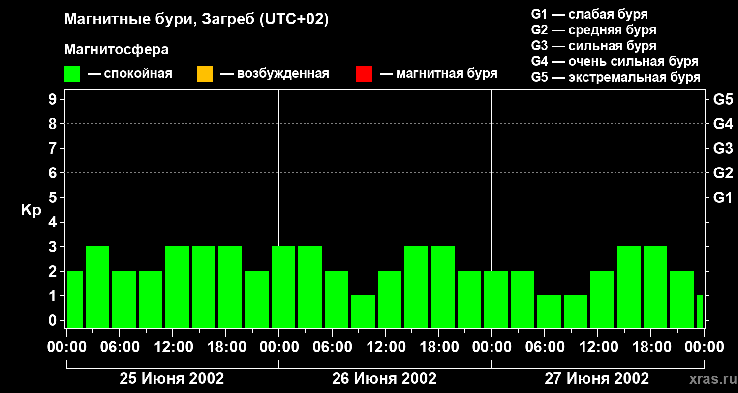 Изменения геомагнитного индекса Kp с 25 по 27 июня 2002 года для средних широт