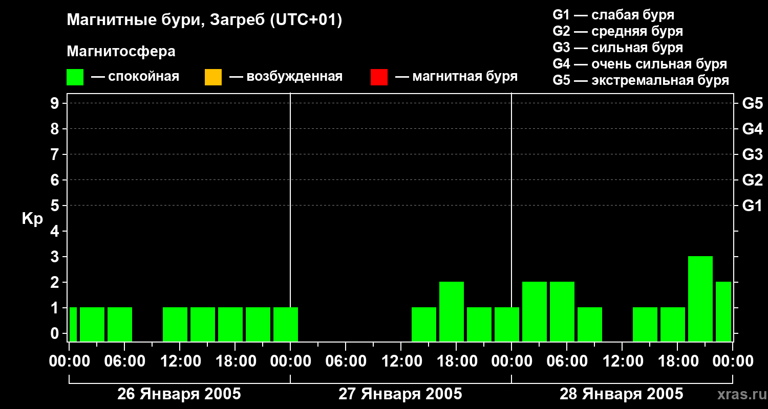 Изменения геомагнитного индекса Kp с 26 по 28 января 2005 года для средних широт