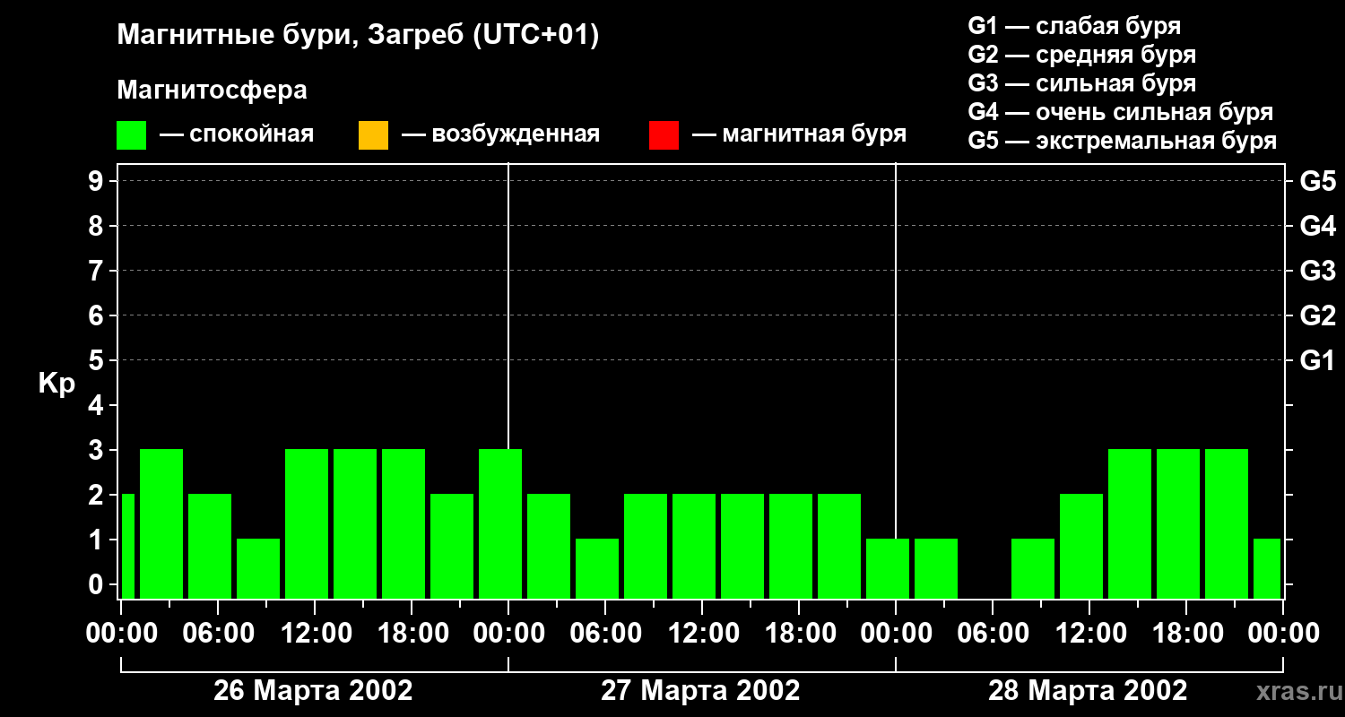 Изменения геомагнитного индекса Kp с 26 по 28 марта 2002 года для средних широт