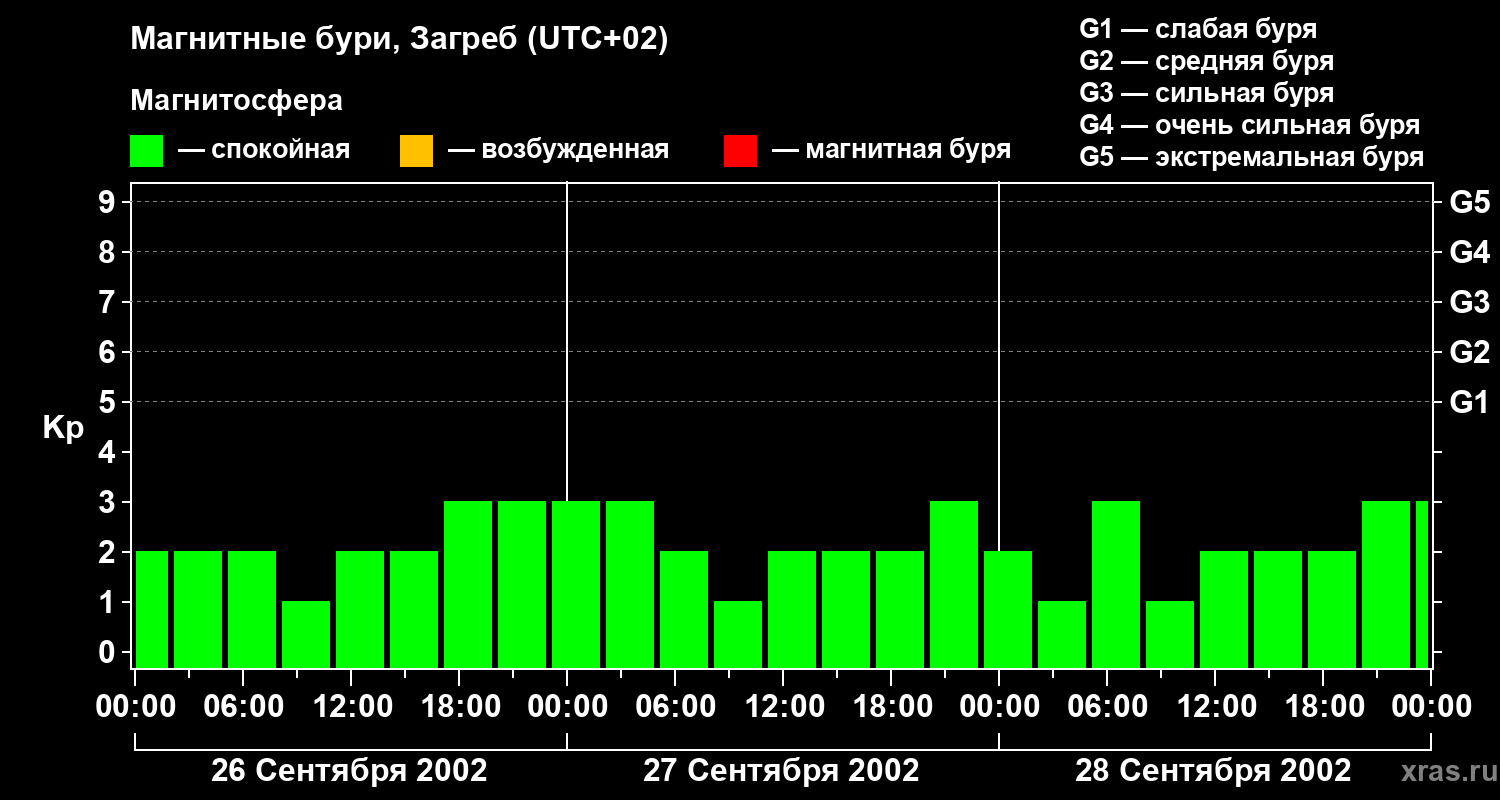 Изменения геомагнитного индекса Kp с 26 по 28 сентября 2002 года для средних широт