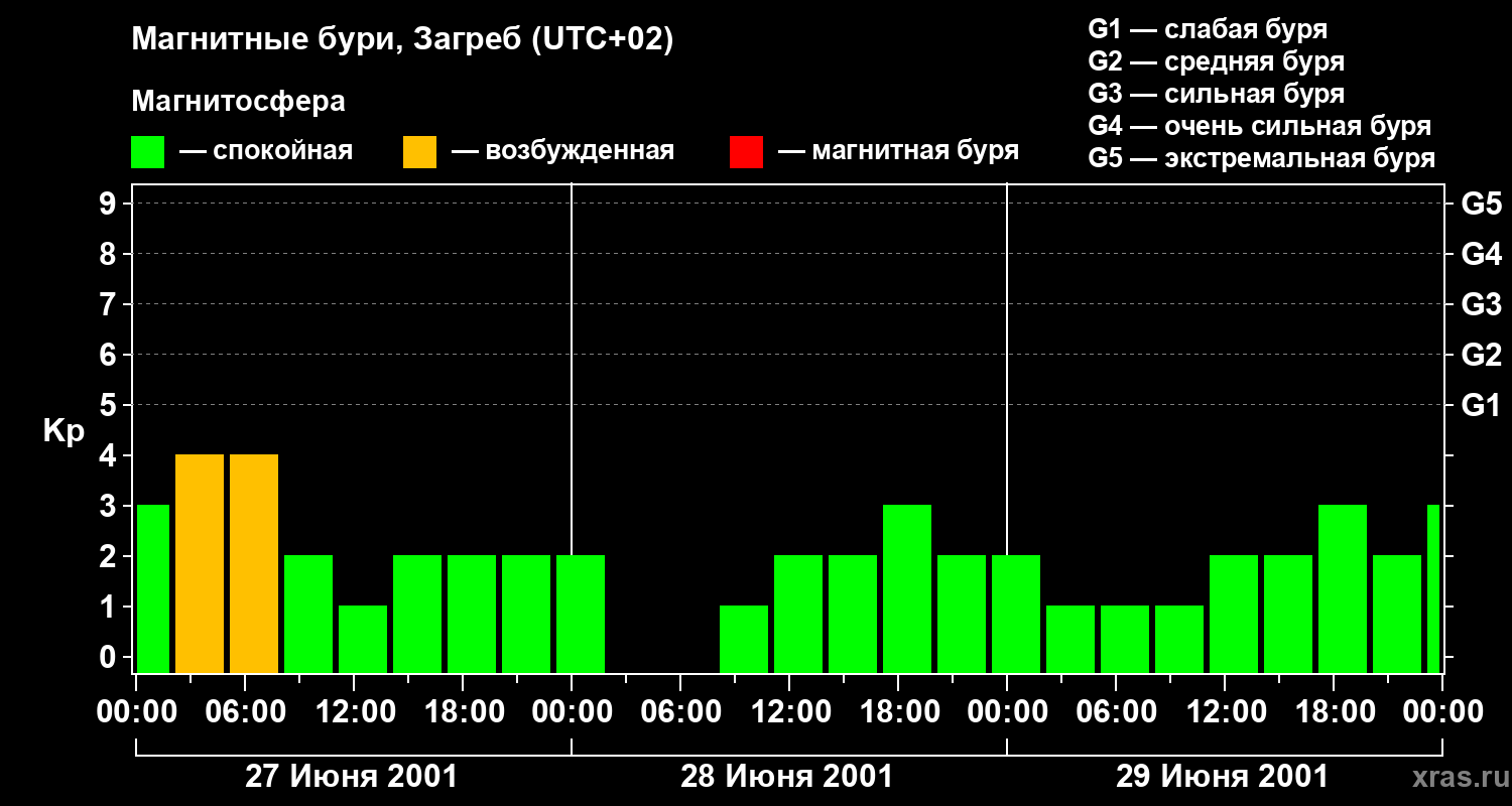 Изменения геомагнитного индекса Kp с 27 по 29 июня 2001 года для средних широт