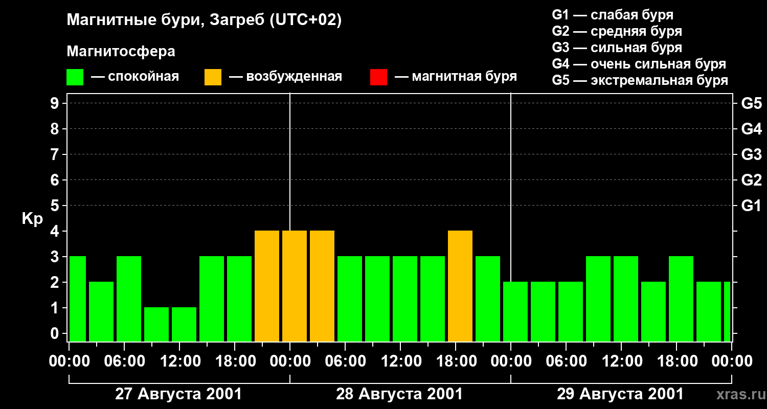 Изменения геомагнитного индекса Kp с 27 по 29 августа 2001 года для средних широт