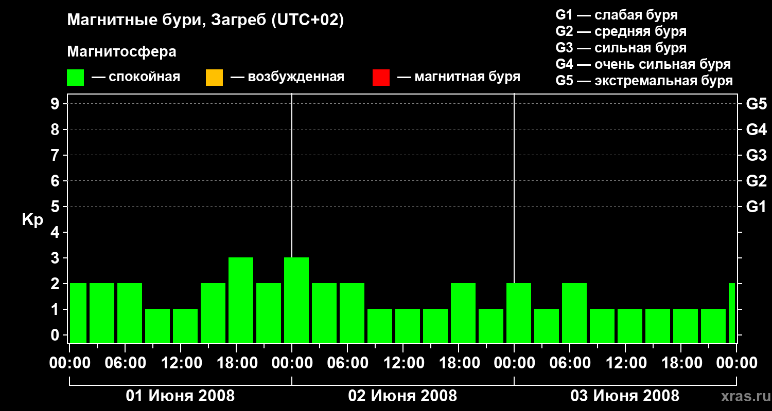 Изменения геомагнитного индекса Kp с 1 по 3 июня 2008 года для средних широт