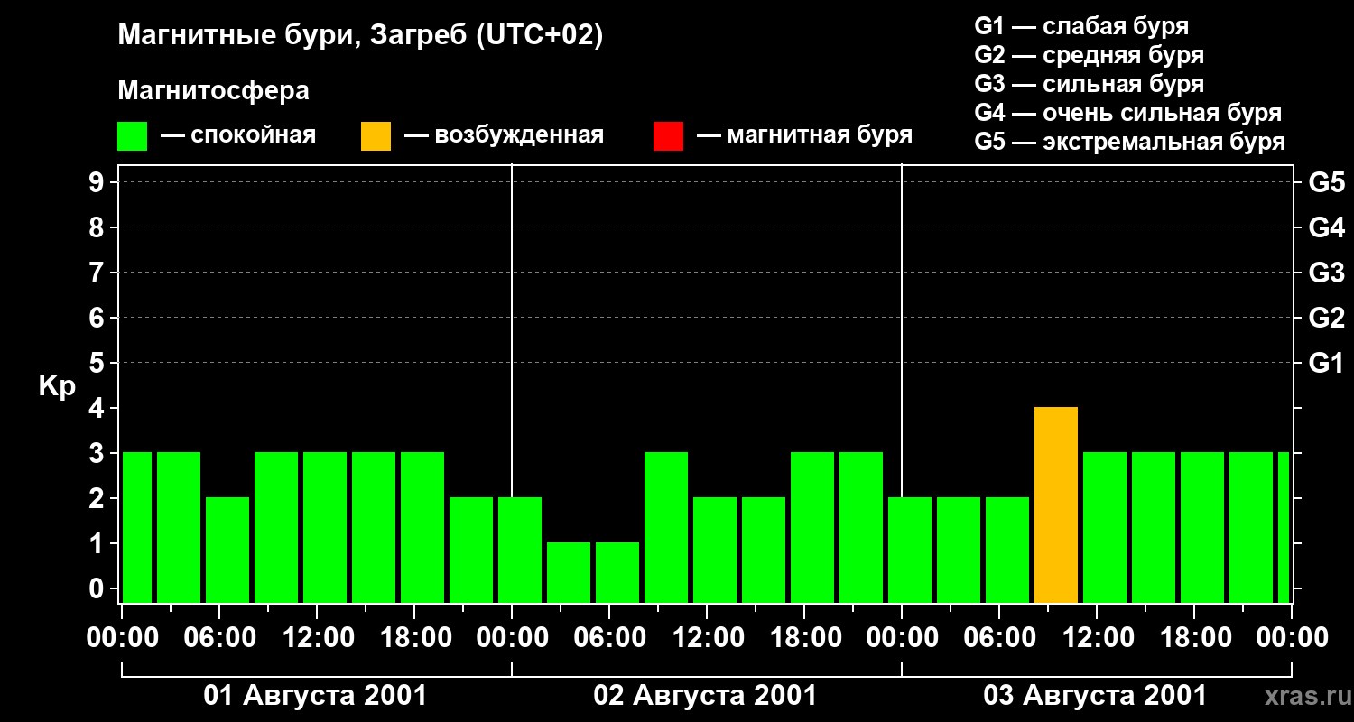 Изменения геомагнитного индекса Kp с 1 по 3 августа 2001 года для средних широт