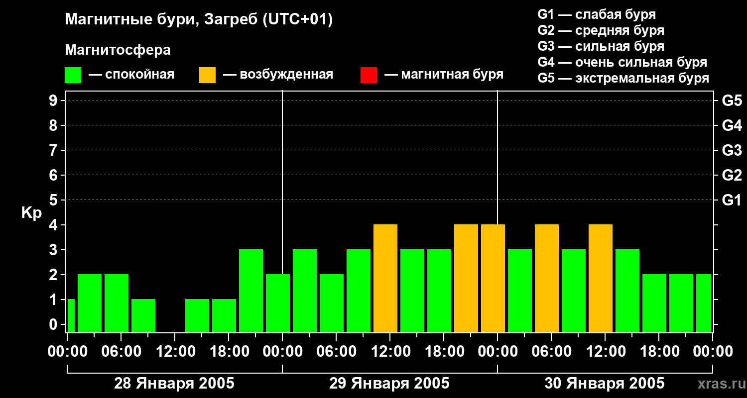Изменения геомагнитного индекса Kp с 28 по 30 января 2005 года для средних широт