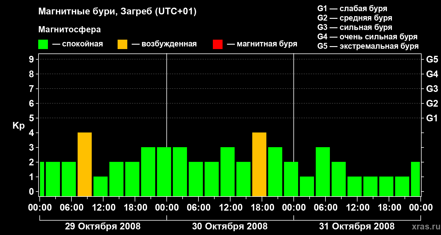 Изменения геомагнитного индекса Kp с 29 по 31 октября 2008 года для средних широт