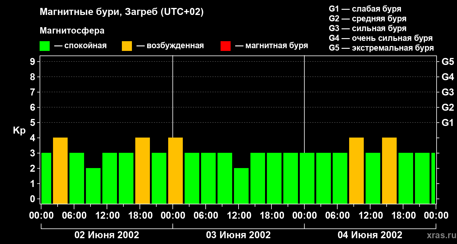 Изменения геомагнитного индекса Kp с 2 по 4 июня 2002 года для средних широт