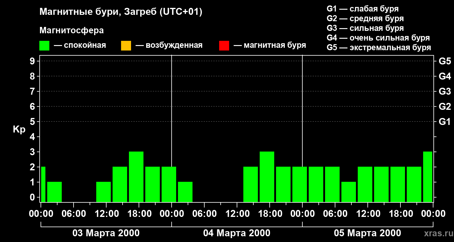 Изменения геомагнитного индекса Kp с 3 по 5 марта 2000 года для средних широт