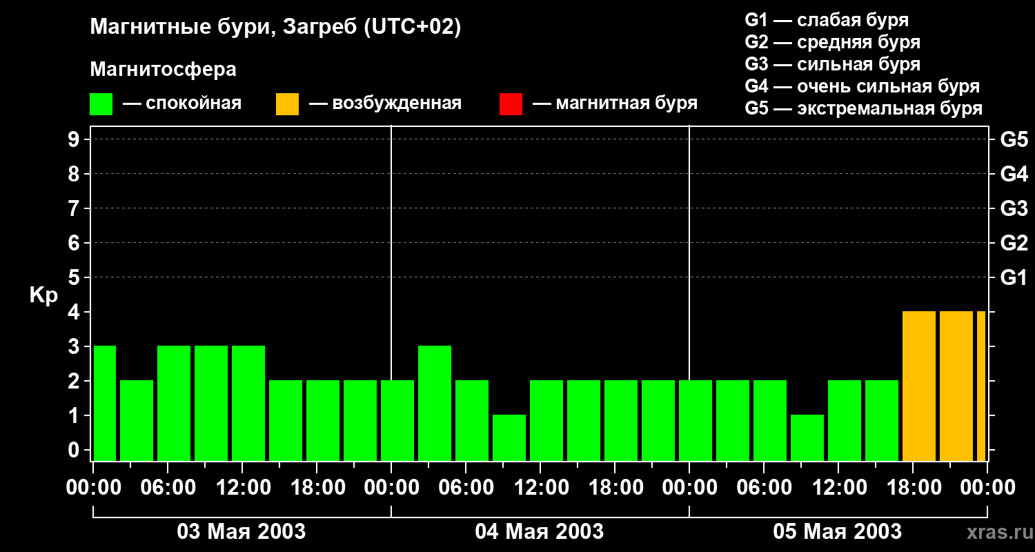 Изменения геомагнитного индекса Kp с 3 по 5 мая 2003 года для средних широт