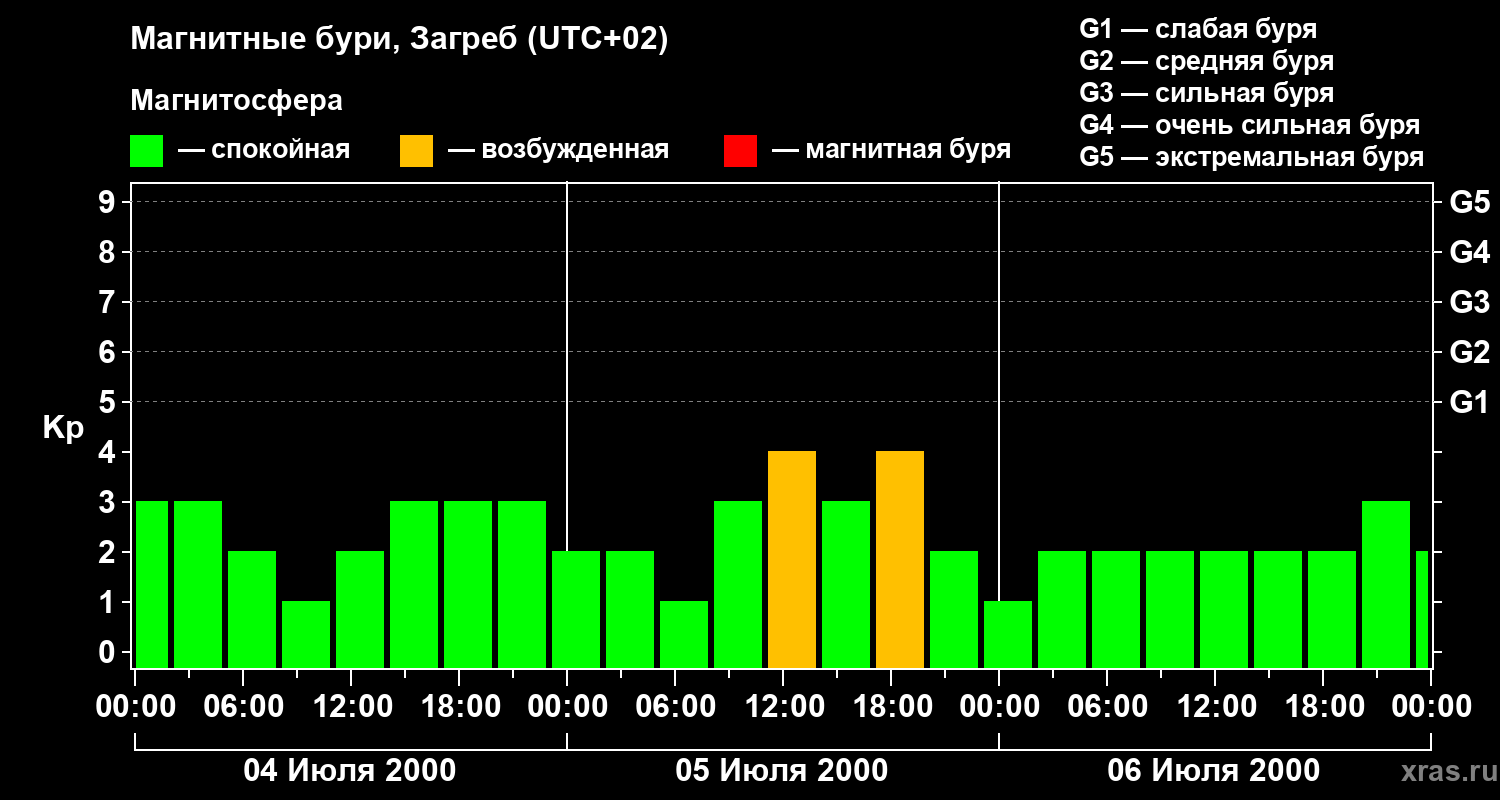 Изменения геомагнитного индекса Kp с 4 по 6 июля 2000 года для средних широт