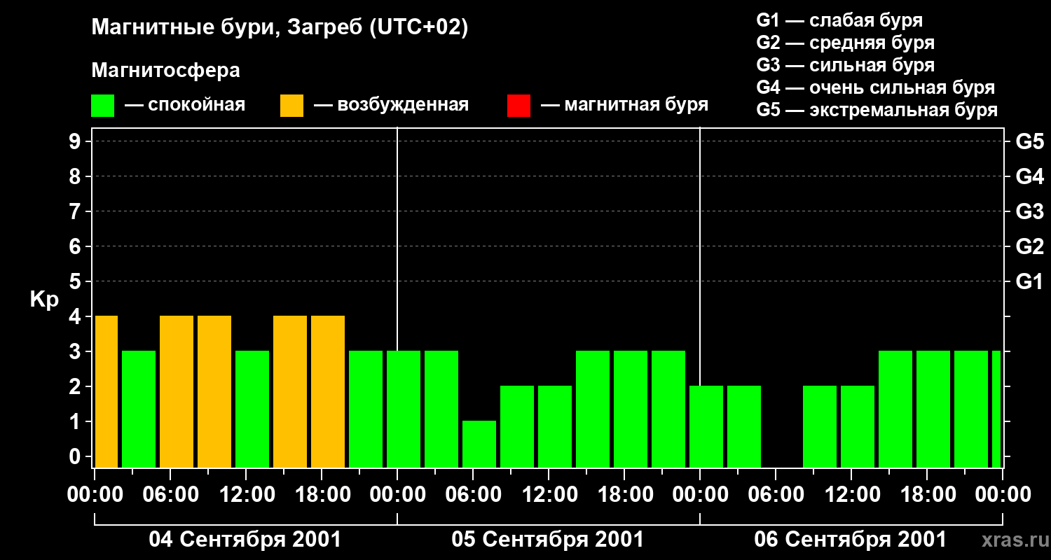 Изменения геомагнитного индекса Kp с 4 по 6 сентября 2001 года для средних широт
