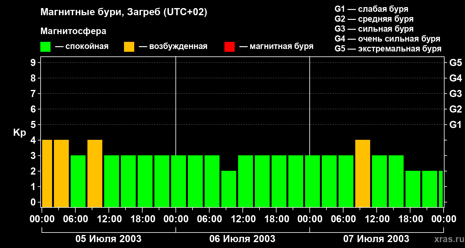 Изменения геомагнитного индекса Kp с 5 по 7 июля 2003 года для средних широт
