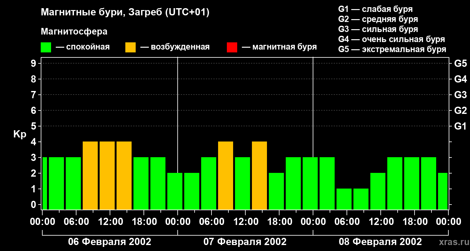 Изменения геомагнитного индекса Kp с 6 по 8 февраля 2002 года для средних широт