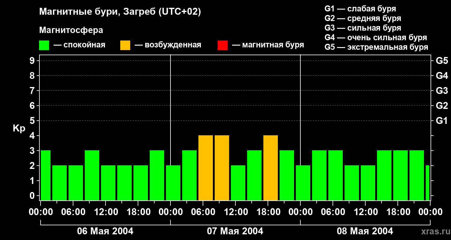 Изменения геомагнитного индекса Kp с 6 по 8 мая 2004 года для средних широт