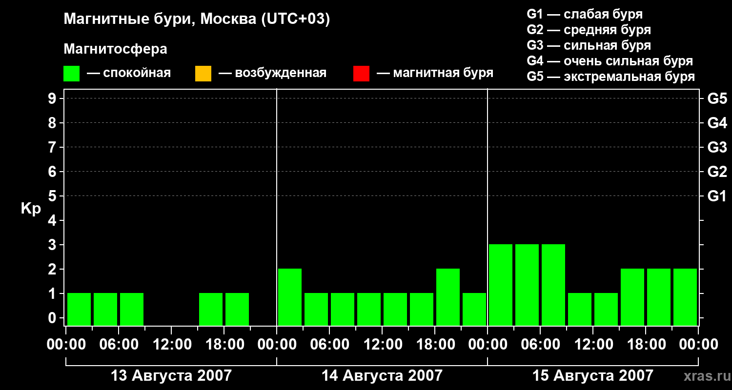 Изменения геомагнитного индекса Kp с 13 по 15 августа 2007 года для средних широт