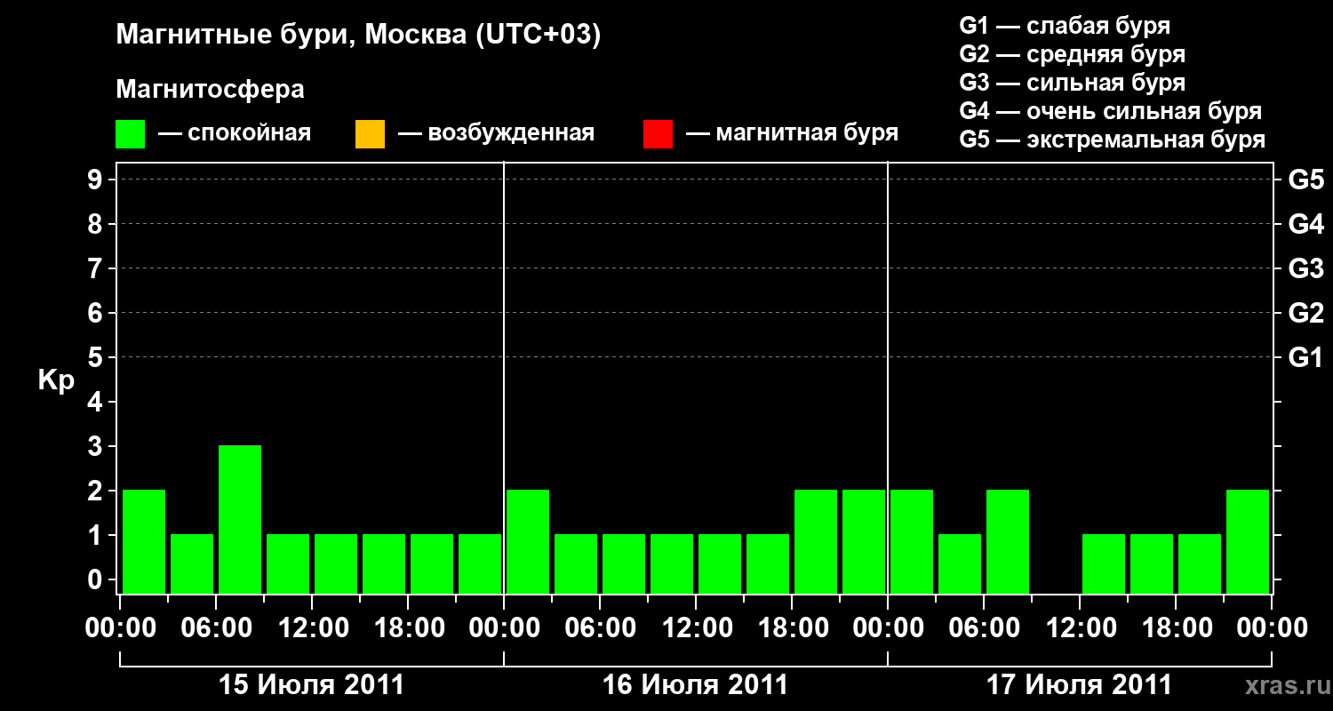 Изменения геомагнитного индекса Kp с 15 по 17 июля 2011 года для средних широт