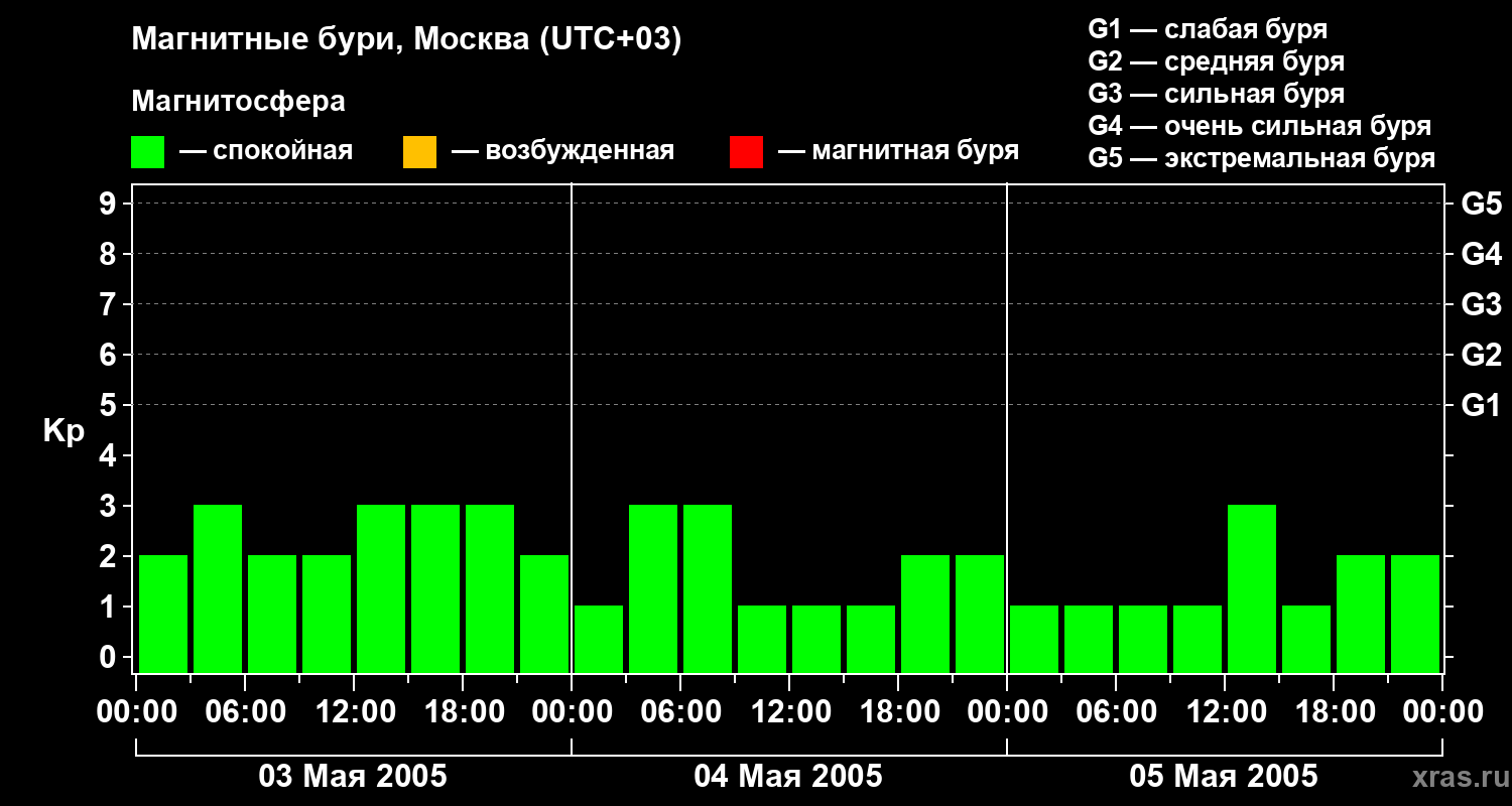 Изменения геомагнитного индекса Kp с 3 по 5 мая 2005 года для средних широт