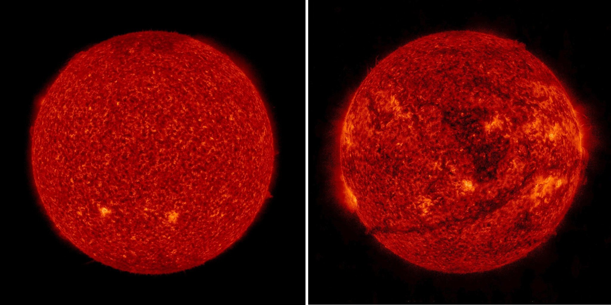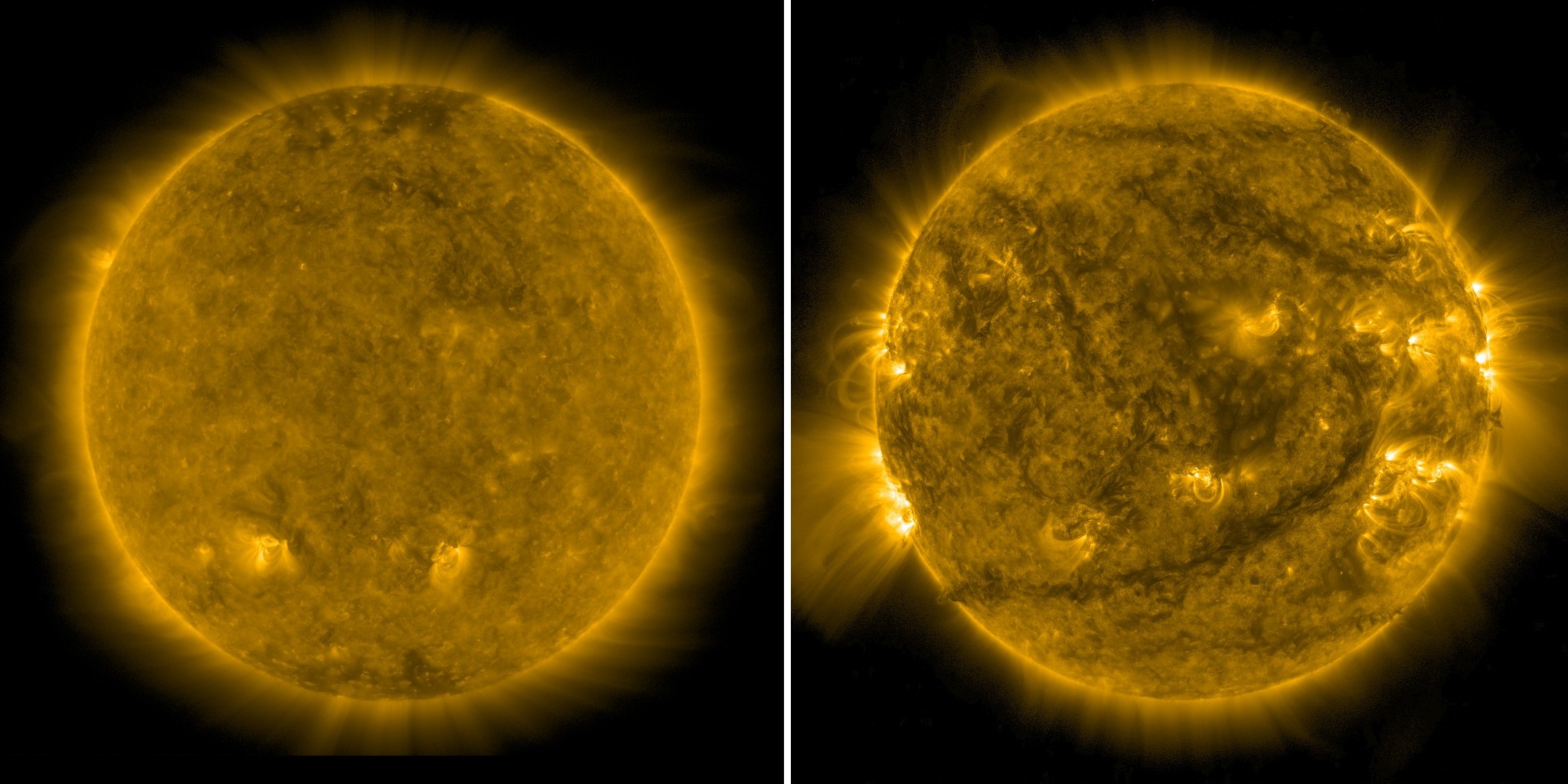 Фотографии позволяют наглядно увидеть, насколько значительной является разница не только в уровне активности, а даже просто во внешнем виде Солнца на разных стадиях солнечного цикла: в данном случае в самом начале текущего 25-го цикла активности (2020-й год) и сейчас, недалеко от его максимума.