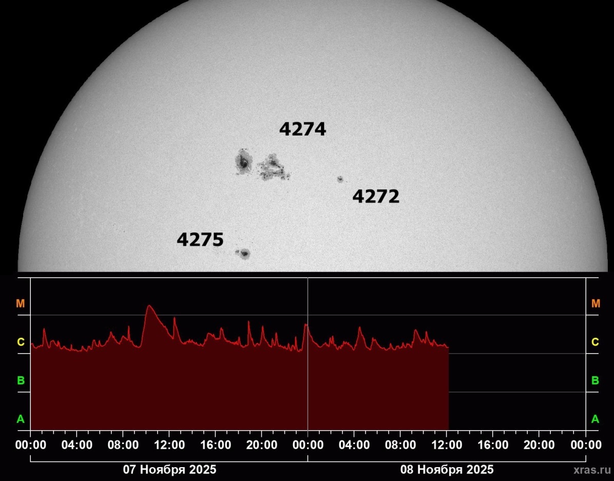 Среди областей выделяется размером группа пятен 4274, которая показывает и самую большую вспышечную активность, причем на протяжении уже более месяца. Данный центр центр возник на Солнце в середине октября, произвел тогда более 100 вспышек, потом ушел на обратную сторону, где сформировал несколько X взрывов, снова вернулся к Земле, произвел после возвращения ещё несколько десятков вспышек, в том числе уровня X, и вот снова наблюдается точно напротив Земли в полной боевой готовности, словно никуда и не уходил. Надо сказать, что прожить полный солнечный оборот группам пятен удаётся не часто, и такое жизнелюбие внушает уважение, несмотря на связанные с этим проблемы — все геомагнитные события последних дней явились откликом на активность именно в 4274.