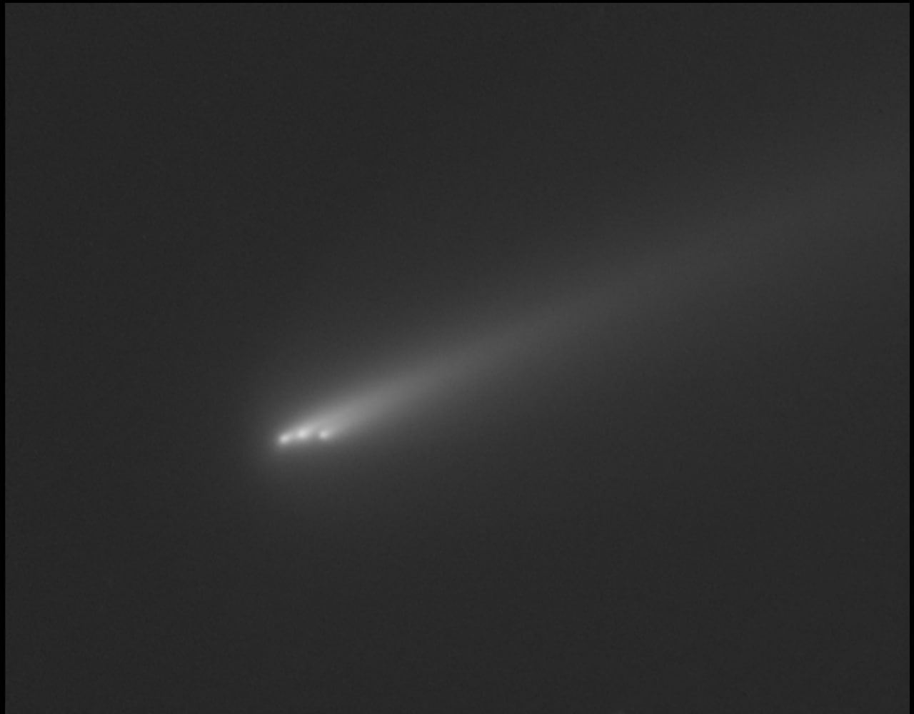 Появляются слухи о распаде на фрагменты объекта 3I/ATLAS. Распад на самом деле зафиксирован у другого объекта со схожим названием — кометы C/2025 K1 (ATLAS) (показана на приложенном изображении). Начало распада зафиксировано, судя по всему, еще 12-13 ноября. На поступающих кадрах видно, как минимум, 3 крупных фрагмента, но при более высокой детализации, с большой вероятностью, могут различаться и более мелкие ядра.