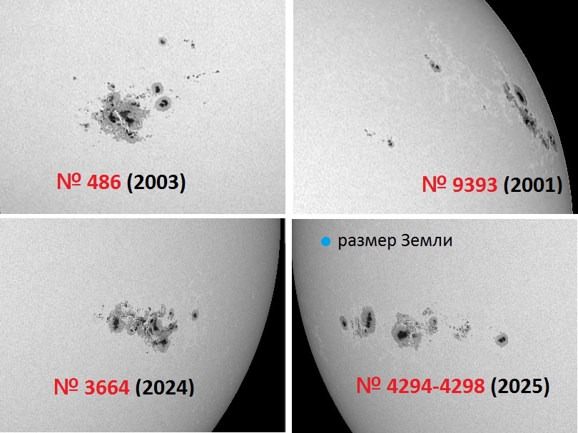 На Солнце продолжает наблюдаться один из крупнейших в истории наблюдений комплексов солнечных пятен, образовавшийся из трёх областей с номерами 4294, 4296 и 4298.
