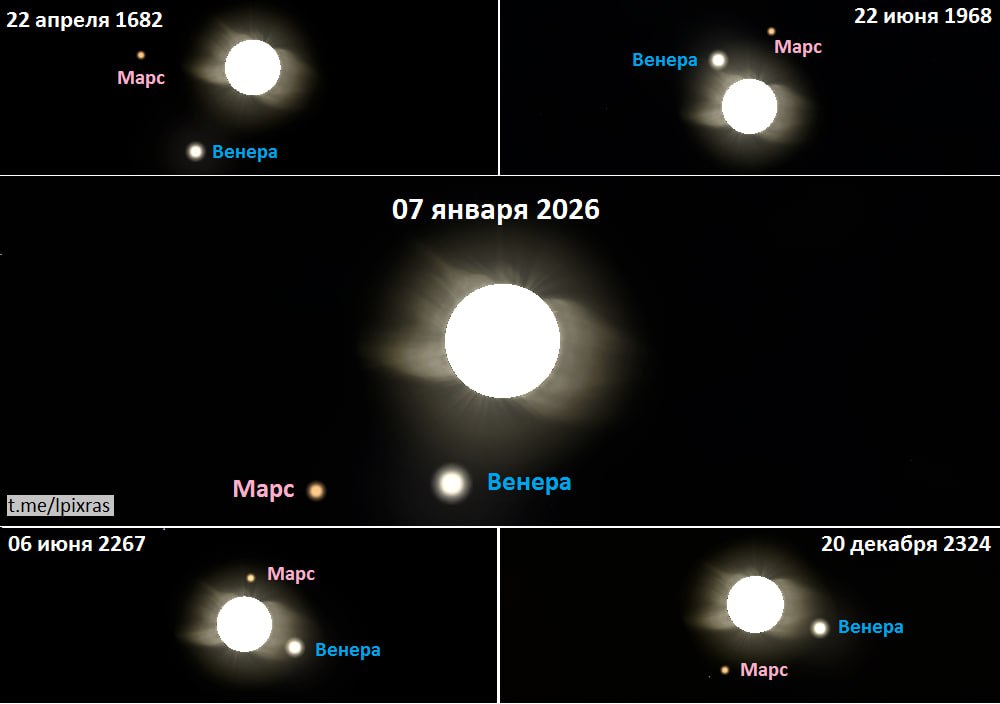 Соединение Марса и Венеры с Солнцем, подобное ожидающемуся в Рождество 2026 года, произойдет в следующий раз только в 23-м веке