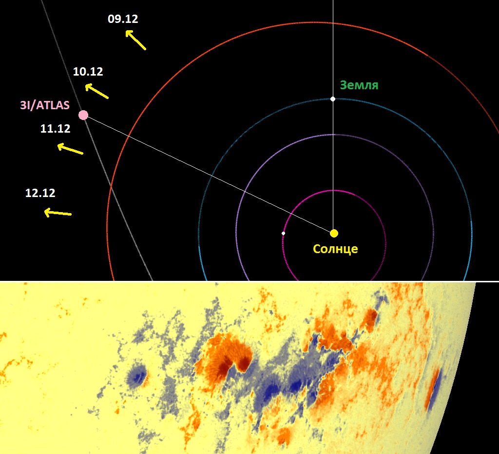 В ближайшие 2–3 суток наступает чрезвычайно важный момент для всех сторонников конспирологических теорий, в большом количестве сформированных вокруг межзвёздного объекта 3I/ATLAS. Один из крупнейших за последнее десятилетие и самый большой в этом году комплекс солнечных пятен 4294–4296–4298, появившийся на видимой стороне Солнца около 10 дней назад, выходит сейчас в зону прямых ударов по небесному телу. Межзвёздный «корабль-комета» движется по удаляющейся от Солнца траектории, причём располагается уже не с обратной стороны от Солнца, а на обращённой к Земле стороне под углом около 65 градусов от линии Солнце–Земля. По отношению к Земле объект продолжает приближаться и уже 19 декабря сойдётся с планетой на минимальное расстояние.
