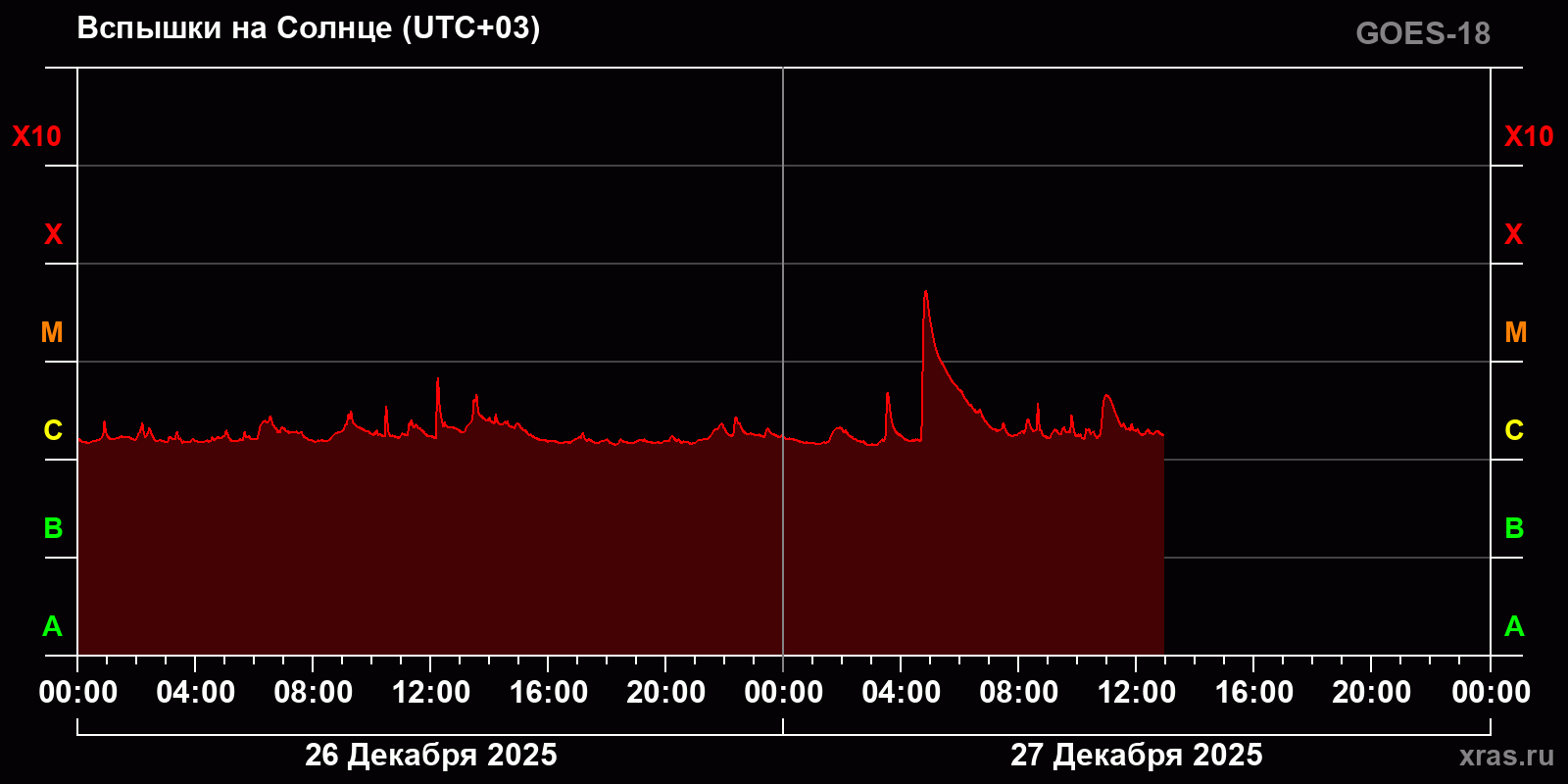 Интересно, что событие 8 декабря и сегодняшнее произошли, судя по всему, в одной и той же области Солнца, которая в начале декабря находилась на западном краю Солнца. За прошедшее время Солнце совершило примерно 2/3 оборота вокруг оси, и тот же центр активности, пройдя по обратной стороне, снова вернулся на видимую с Земли сторону — теперь на восточный край.