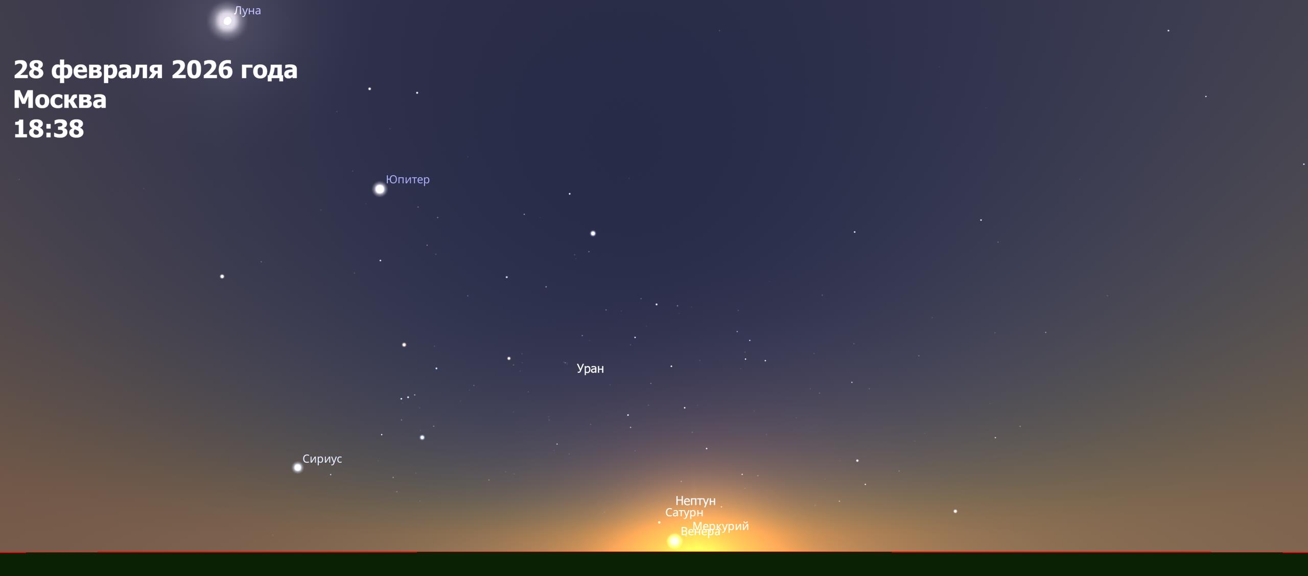 В СМИ массово распространяются сведения об ожидающемся 28 февраля грандиозном параде из 6 планет: по мере удаления от Солнца это будут Меркурий, Венера, Юпитер, Сатурн, Уран и Нептун.