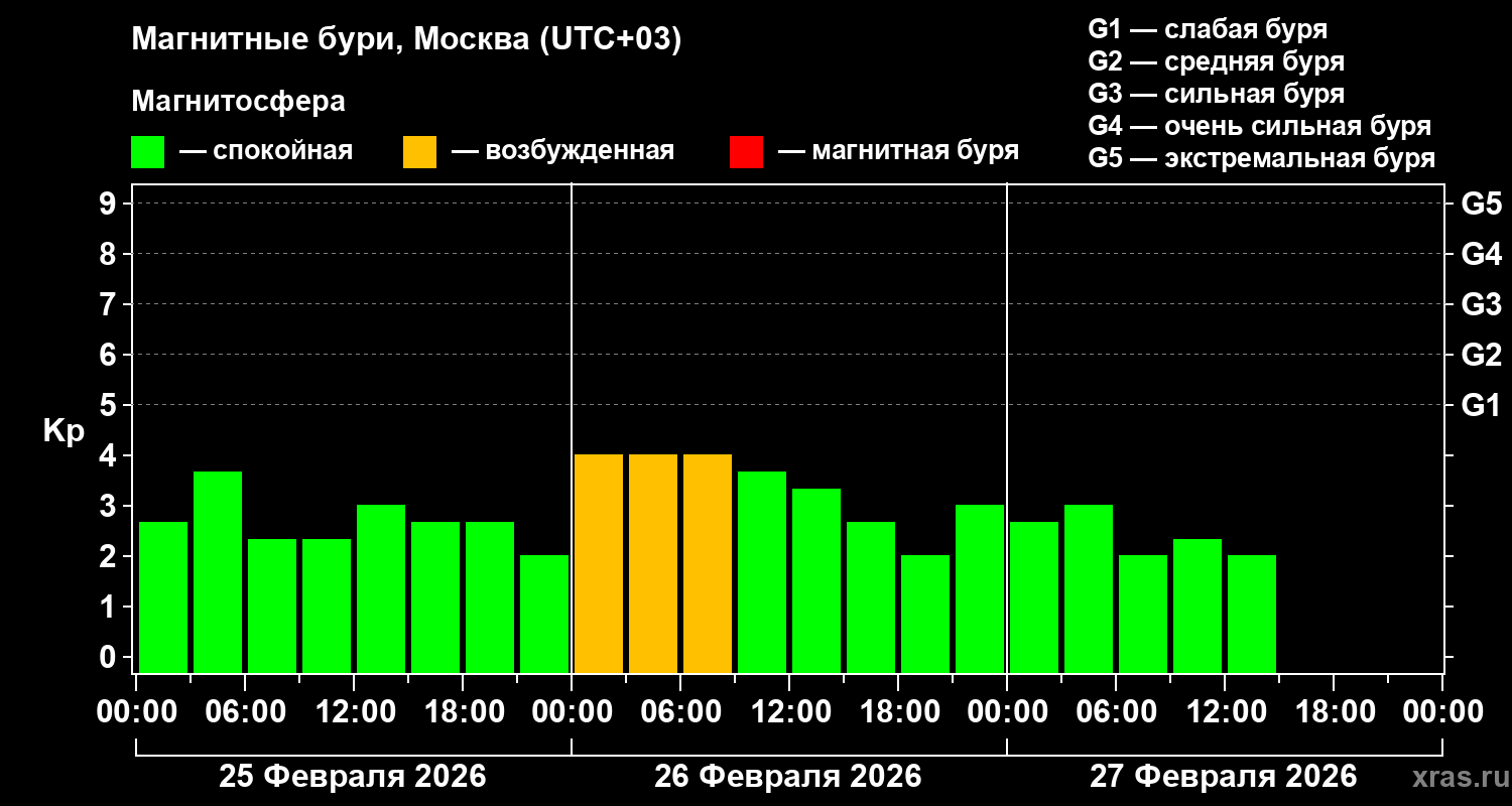 Геомагнитная активность определяется сейчас исключительно вариациями солнечного ветра, который слабо возмущён. В результате геомагнитный индекс Kp также последние дни незначительно повышен и иногда даже выходит на жёлтый уровень. Но в целом какими-то серьезными событиями это трудно назвать. Глобально магнитное поле Земли спокойное.