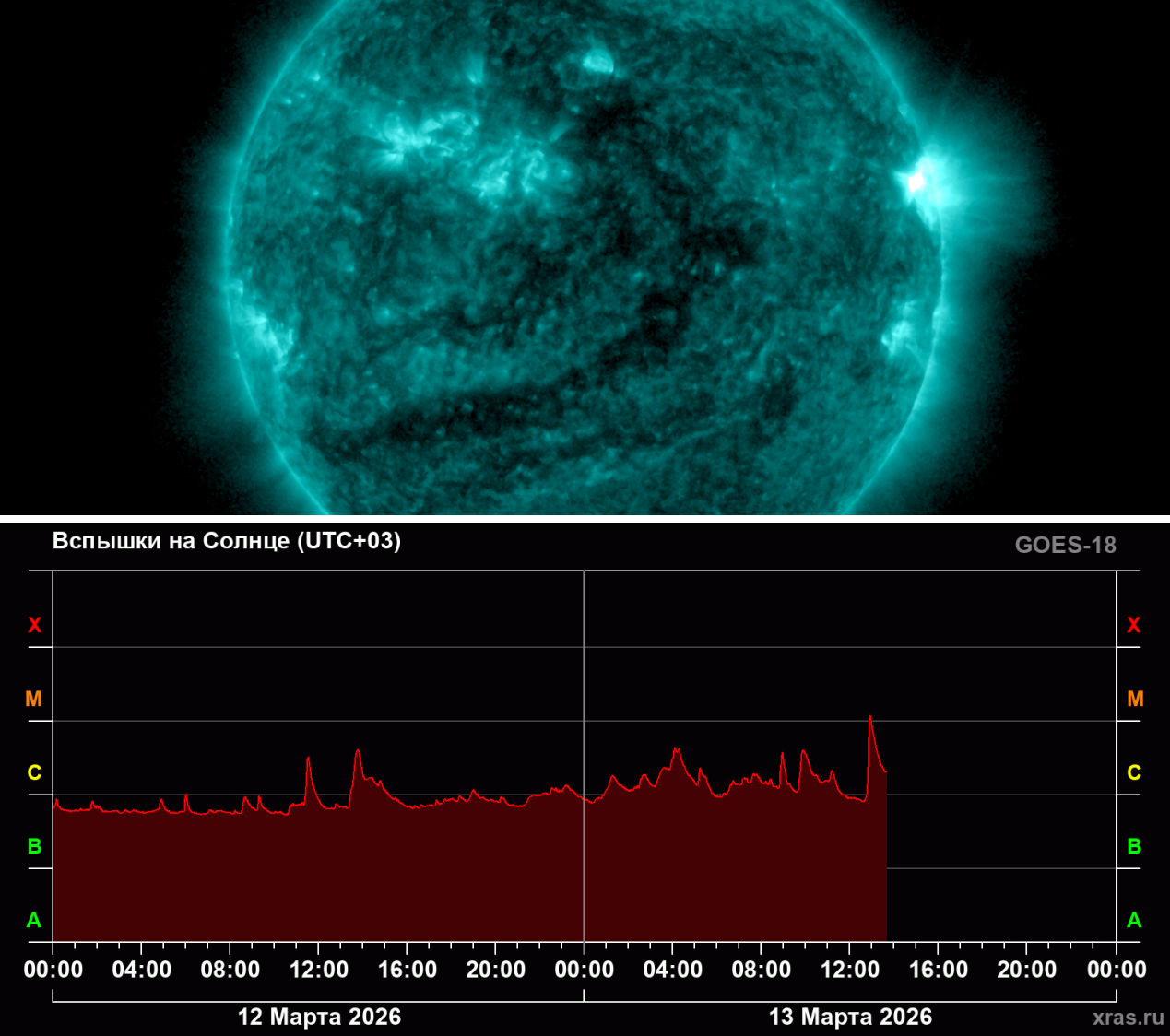 Поступила информация о зарегистрированной только что вспышке M-класса на Солнце. Максимум излучения был достигнут в 12:55 по московскому времени. Продолжительность вспышки составила около 20 минут.