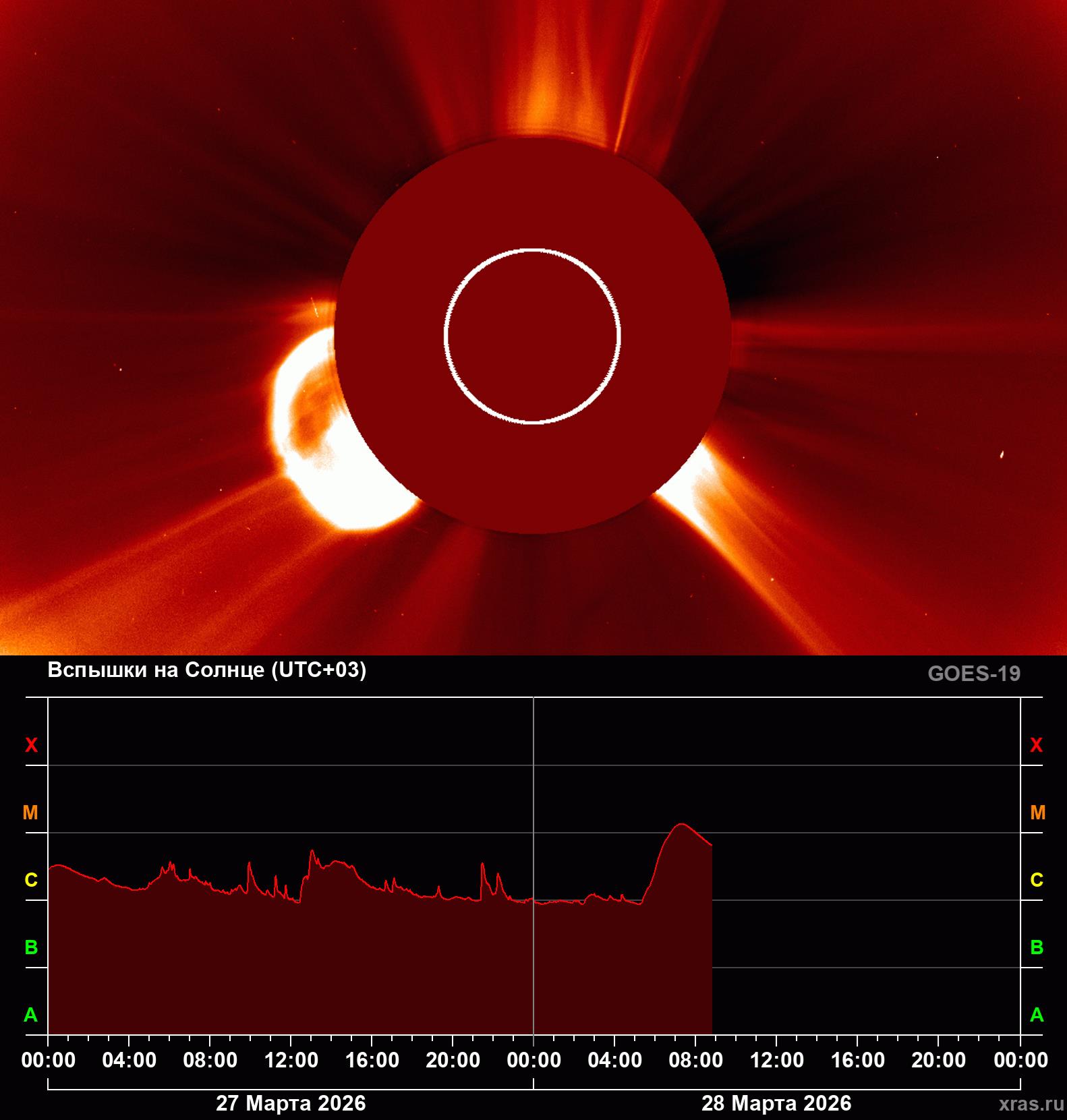 Судя по тому, что присылают коронографы и по профилям рентгеновского излучения, на Солнце прямо сейчас развивается крупный выброс плазмы. Событие привлекает внимание в том числе потому, что в ночь с 1 на 2 апреля запланирован первый с 1972 года пилотируемый полет к Луне, при котором экипаж из четырех человек впервые более чем за полвека выйдет за пределы защитного действия магнитного поля Земли. В отличие от околоземных орбит, на которых возможны лишь вторичные проявления космической погоды (колебания магнитного поля, изменения плотности атмосферы, рост числа заряженных частиц), на дальних орбитах корабль оказывается прямо внутри облака солнечной плазмы, окутывающего на несколько суток планету. В этой связи солнечная активность в ближайшие дни будет отслеживаться особенно пристально. Последний известный случай переноса запуска миссии, связанной с дальним космосом, произошел в ноябре прошлого года, когда НАСА по распространенному агентством заявлению перенесло запуск спутников ESCAPADE к Марсу из-за солнечной активности.