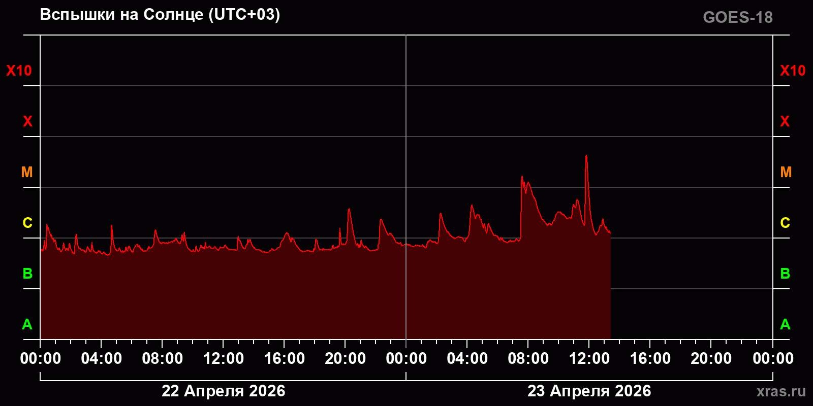 На Солнце продолжается рост активности. Очередной очень эффектный сильный взрыв, наблюдавшийся на левом краю Солнца, появился на снимках с космических телескопов около 8 утра по московскому времени. На Солнце, судя по одновременным измерениям потоков рентгеновского излучения, произошла первая за 2 недели вспышка класса M (точный балл — M1.65). Последний раз событие данного класса наблюдалось 9 апреля.